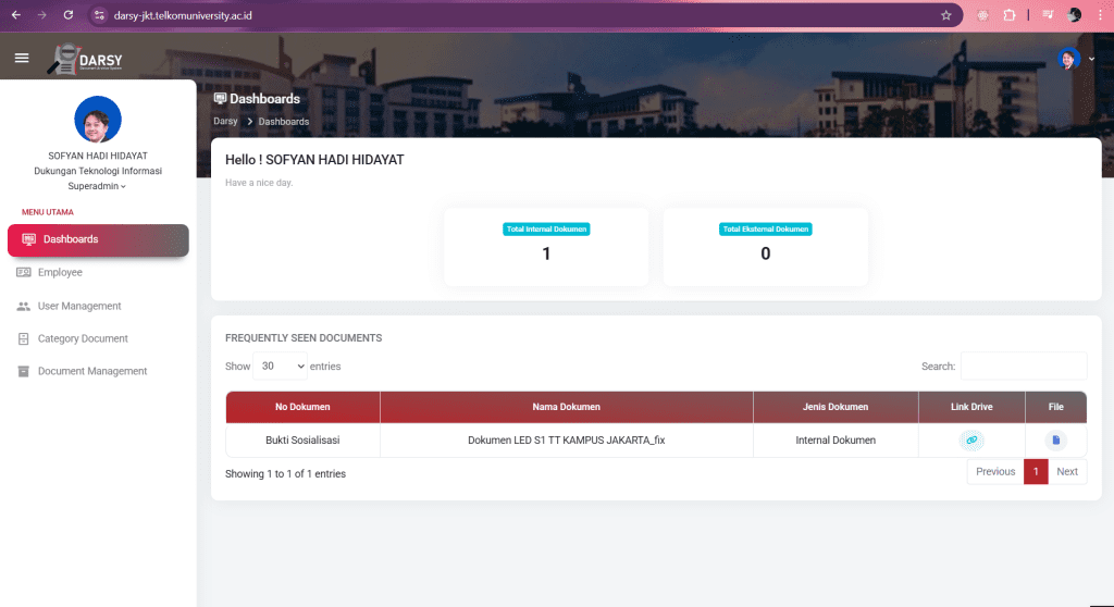 Aplikasi Darsy (Document Archive System) merupakan aplikasi berbasis web untuk membantu operasional manajemen dokumen di lingkungan Program Studi S1 Teknik Telkomunikasi Kampus Jakarta. Aplikasi ini menjadi platform untuk dosen dalam melakukan kolektif dokumen agar mempermudah pengklasifikasian dan mempermudah ketika diperlukan untuk kegiatan tertentu seperti akreditasi, kurikulum, RPS dan kebutuhan lainnya. Berikut penjelasan halaman dan tata cara penggunaan aplikasi Darsy.