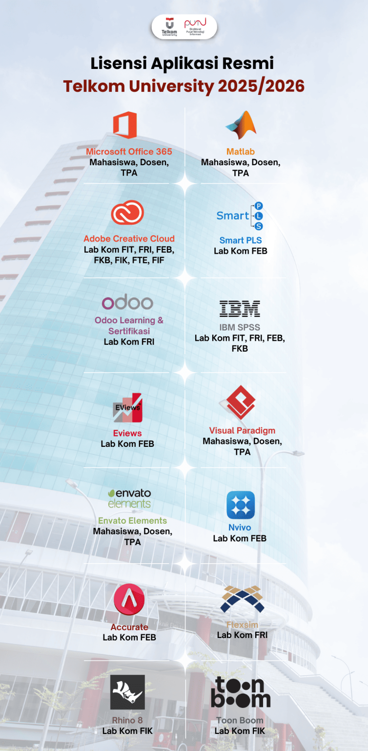 Telkom University untuk periode 2025/2026 telah menambah beberapa software lisensi pihak ke 3 yang dilanggan untuk dipergunakan baik oleh Pegawai dan Mahasiswa di lingkungan kampus Telkom University.